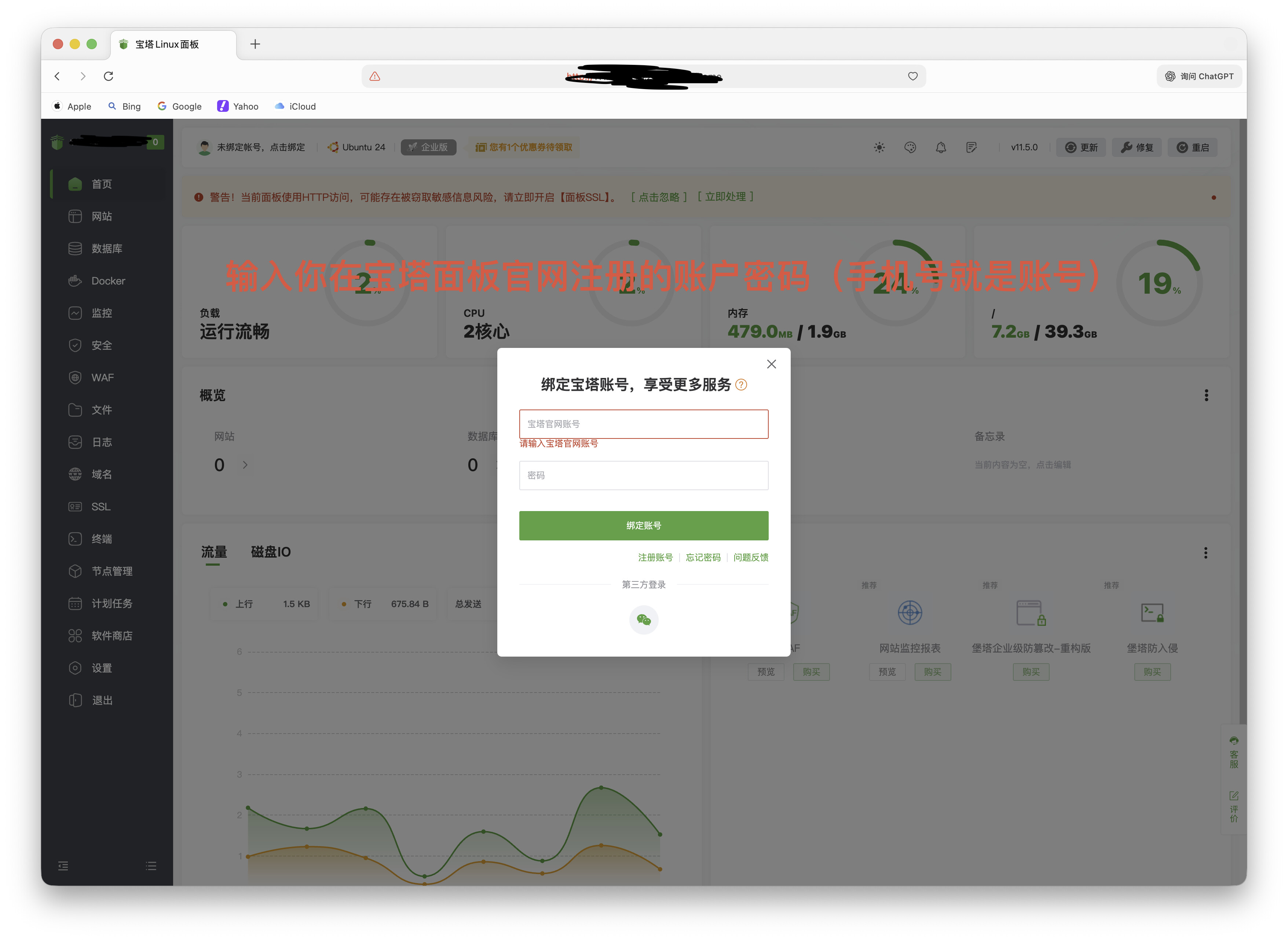 - 浏览器访问面板并绑定宝塔账号