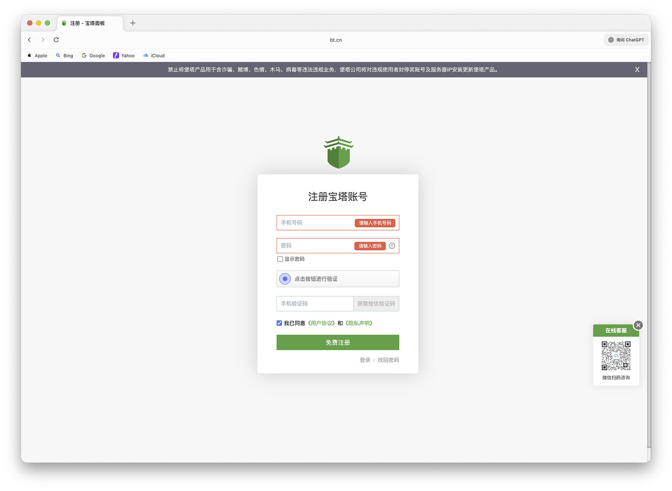 - 使用手机号注册(手机号即宝塔账号)