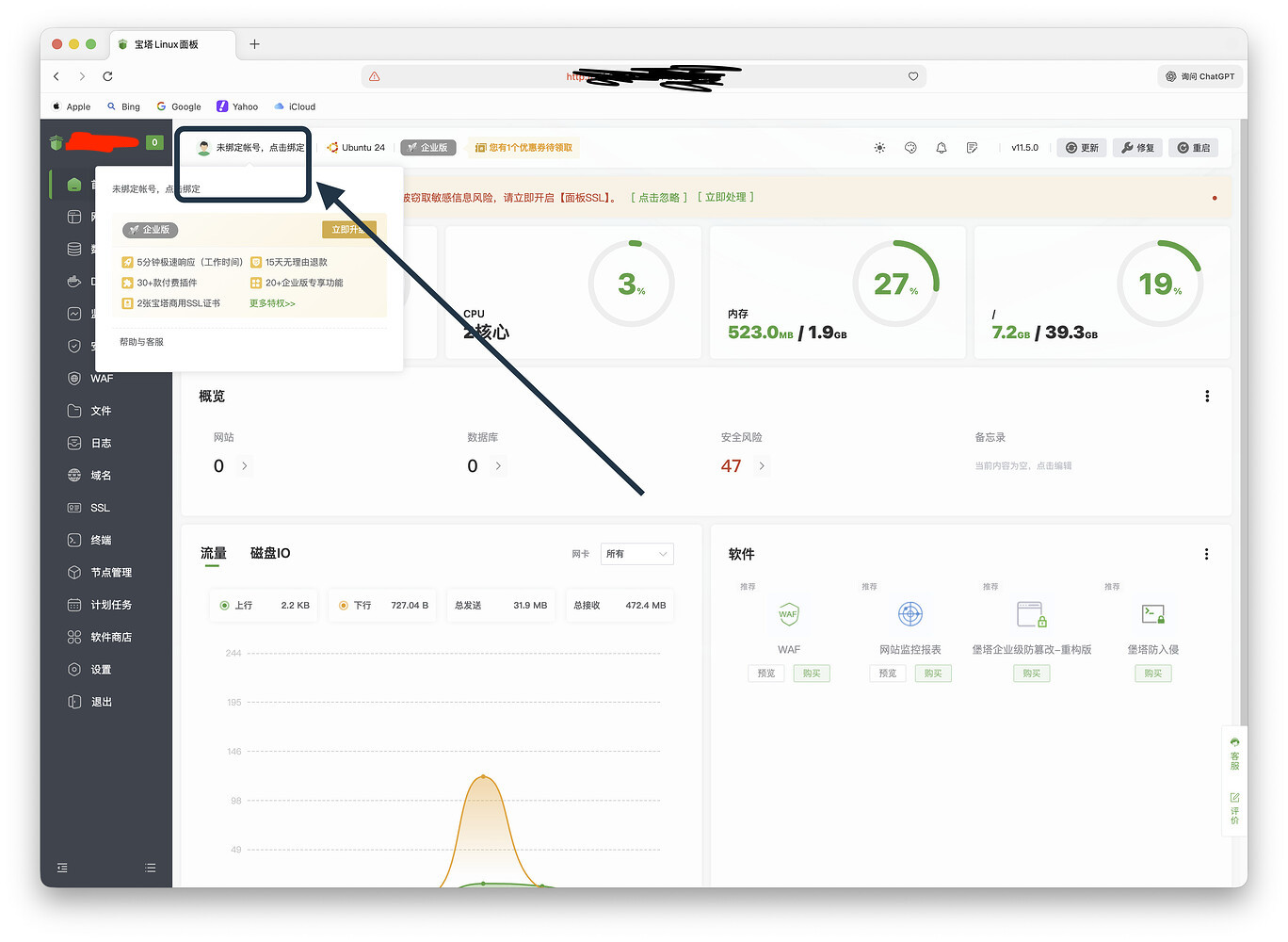 完成绑定后,宝塔面板才可以正常使用、安装软件、管理服务。