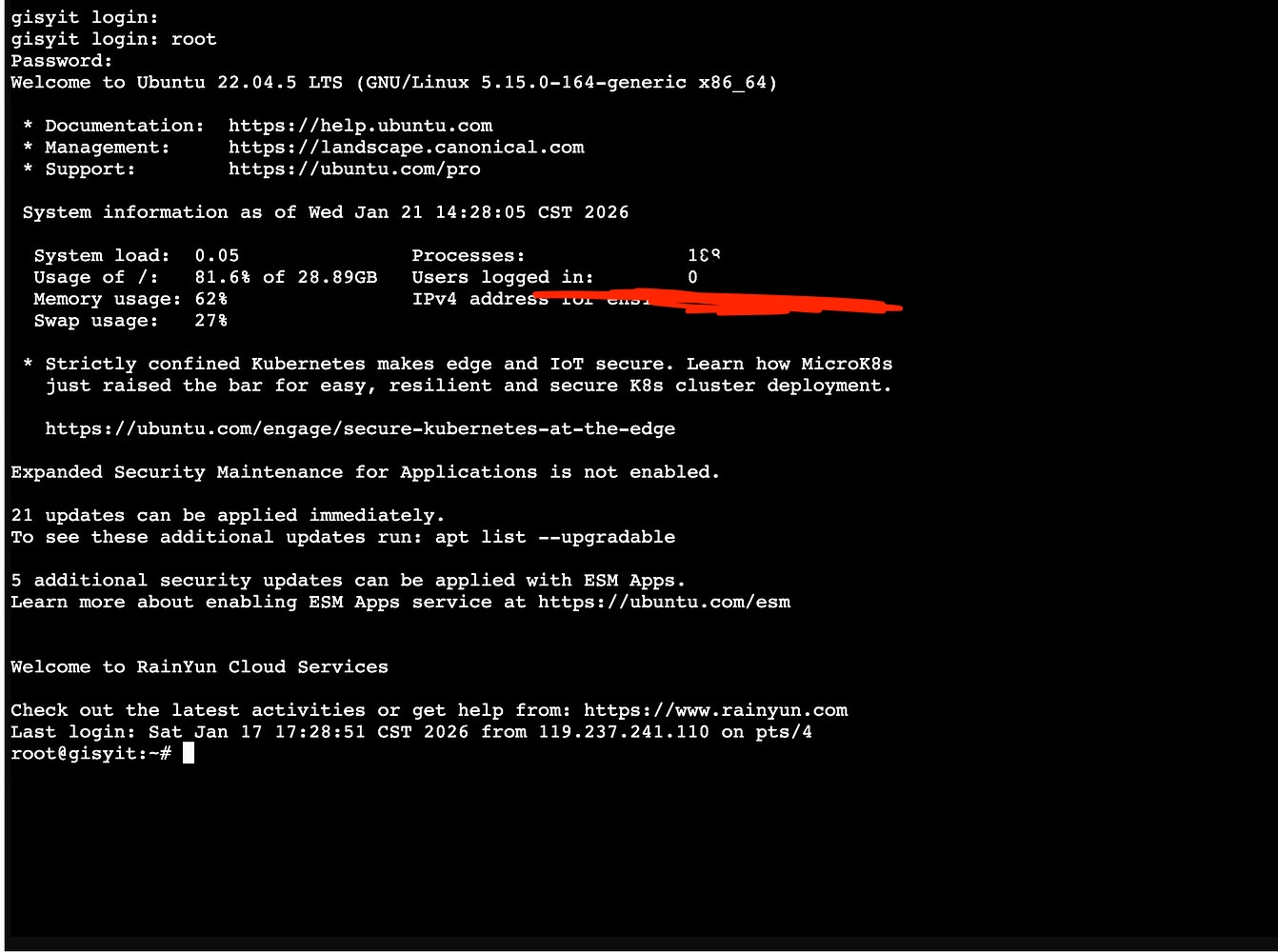 root - 密码:雨云控制台中提供的初始 root 密码