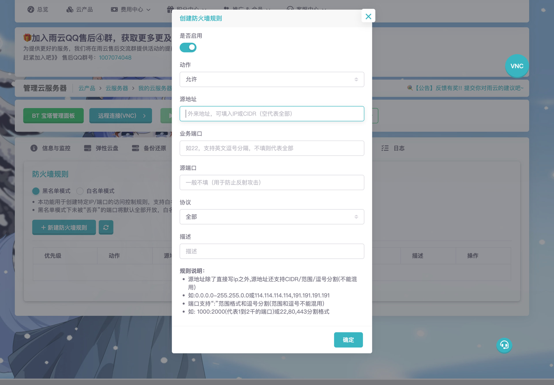 八、在雨云防火墙放行宝塔面板端口